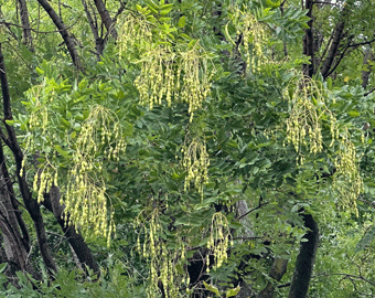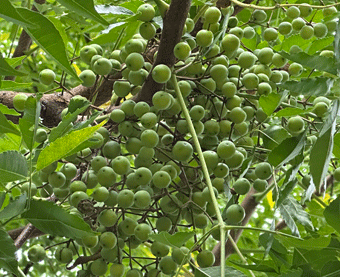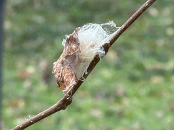 ←大カマキリのメス80 - 100mm 活動期間は8月から10月前後で彼女は長生きである。 植物の枝に200個ほどの卵が入った泡状の卵鞘(ランショウ)を数箇所に産みつける。このような産卵を数度に渡り繰り返して最期を迎える。
