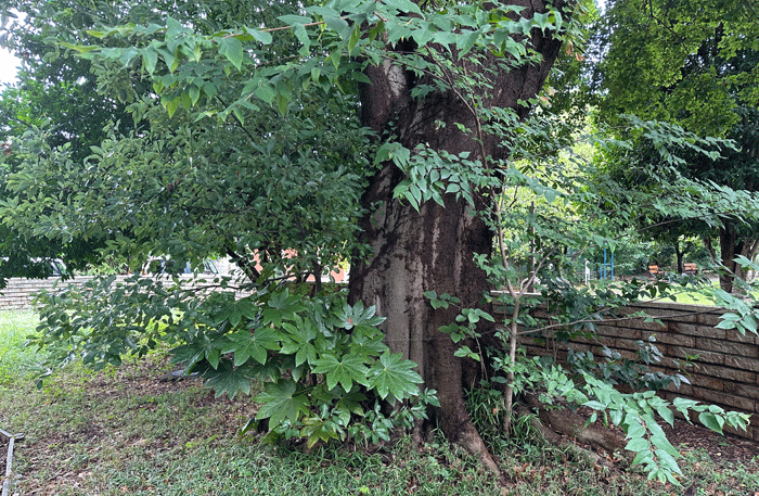 エノキの大木に寄り添う「クスノキ」「ヤツデ」「ケヤキ」