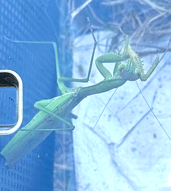 ←大カマキリのメス80 - 100mm 活動期間は8月から10月前後で彼女は長生きである。 植物の枝に200個ほどの卵が入った泡状の卵鞘(ランショウ)を数箇所に産みつける。このような産卵を数度に渡り繰り返して最期を迎える。
